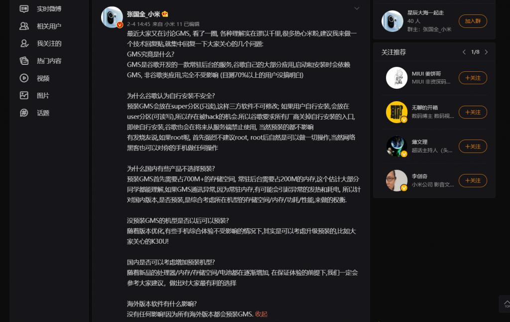 除了「不合規」之外,小米系統軟件總監張國權在微博上詳細的解釋了不適合安裝 GMS 服務的另外原因。