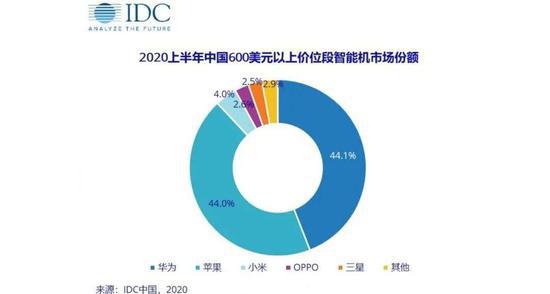 另一方面,近些年來,各家廠商都不再滿足于推出中端走量 / 線上性價比產品,越來越多的高端旗艦手機開始涌現。根據 IDC 發布的 2020 上半年調查報告,國內高端手機市場幾乎被華為與蘋果平分,兩者的市場份額分別為 44.1% 以及 44.0%,占據著將近 90% 的高端市場。