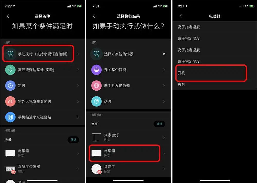 智能家居已經(jīng)不是什么小眾物品,我們同樣可以使用 Apple Watch 的快捷指令來(lái)控制。以控制米家電暖器為例,打開(kāi)《米家》app,在場(chǎng)景中選擇「+> 手動(dòng)執(zhí)行 > 電暖器 > 開(kāi)機(jī)」。
