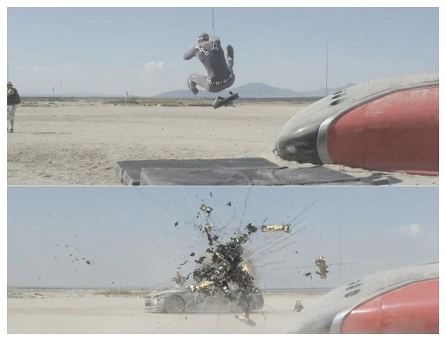 最驚人的場景是一個爆炸機器人的慢動作鏡頭,該場景由一個吊威亞的特技演員,模擬機器人被炸飛的物理特性,是前期拍攝和后期特效協作的一個完美驢子。
