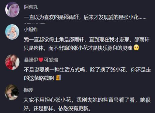 大量網(wǎng)友在邵雨軒直播間評論,說她的視頻太尷尬了,本以為自己喜歡的是邵雨軒,后來才發(fā)現(xiàn)愛的是張小花。邵雨軒不是說換一種生活方式嗎,除了換了張小花,她還是走的這條路。