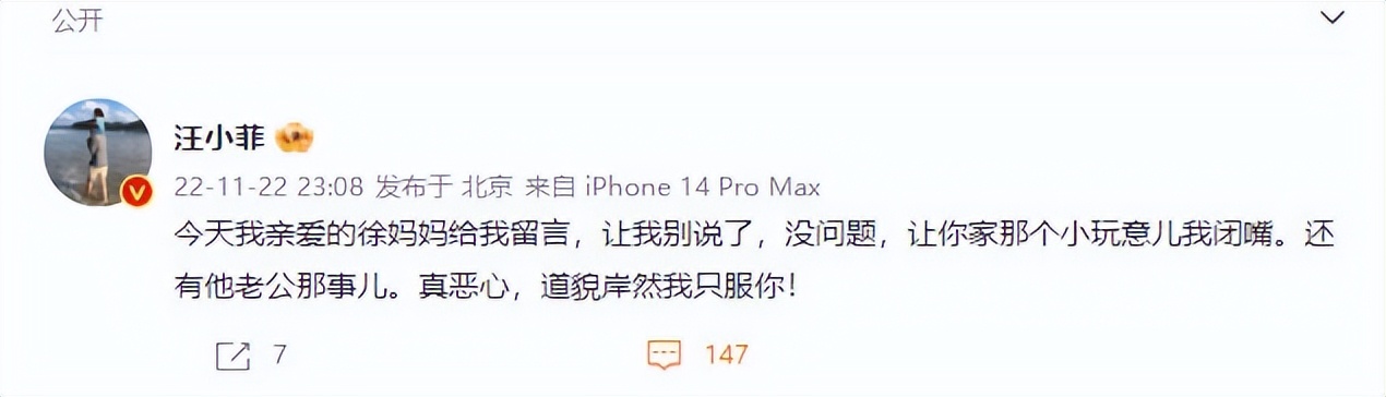 同樣是11月22日晚,汪小菲發微博說:“今天我親愛的徐媽媽給我留言,讓我別說了,沒問題,讓你家那個小玩意兒給我閉嘴,還有她老公那事兒,真惡心,道貌岸然我只服你。”看來,S媽覺得“解鈴還須系鈴人”,發牢騷沒用,還是得向汪小菲求饒。