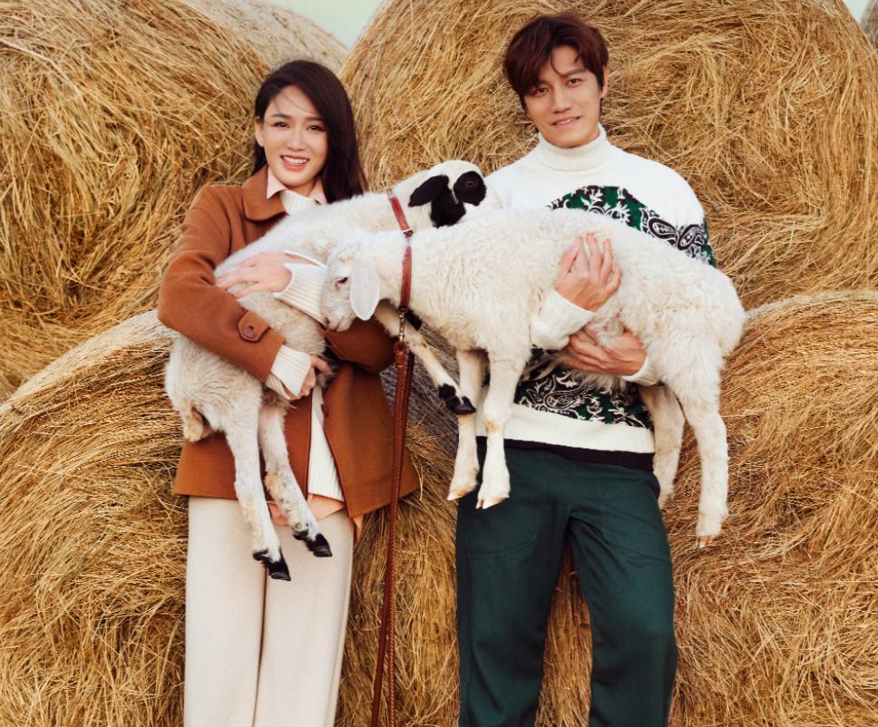 接下來就是前不久剛剛宣布婚訊的陳喬恩與艾倫,相比前面兩張堪比大片的官宣照,陳喬恩的就顯得接地氣多了,她穿著風衣夾克,艾倫穿著白色毛衣,兩人抱著羊羔畫面頗有趣味。