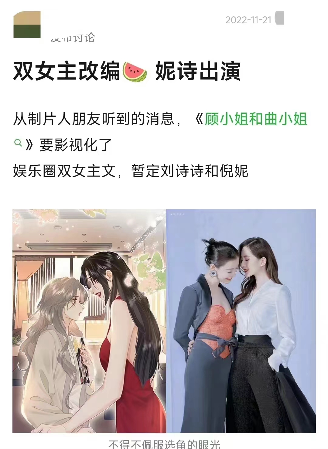 有消息稱倪妮、劉詩詩即將三搭出演新劇《顧小姐和曲小姐》,該劇改編自同名漫畫,是一部雙女主娛樂圈文!從《流金歲月》《1921》到《顧小姐和曲小姐》,不得不稱贊片方的選角,跟“為妮寫詩”CP簡直適配度滿分!有點(diǎn)期待官宣了~