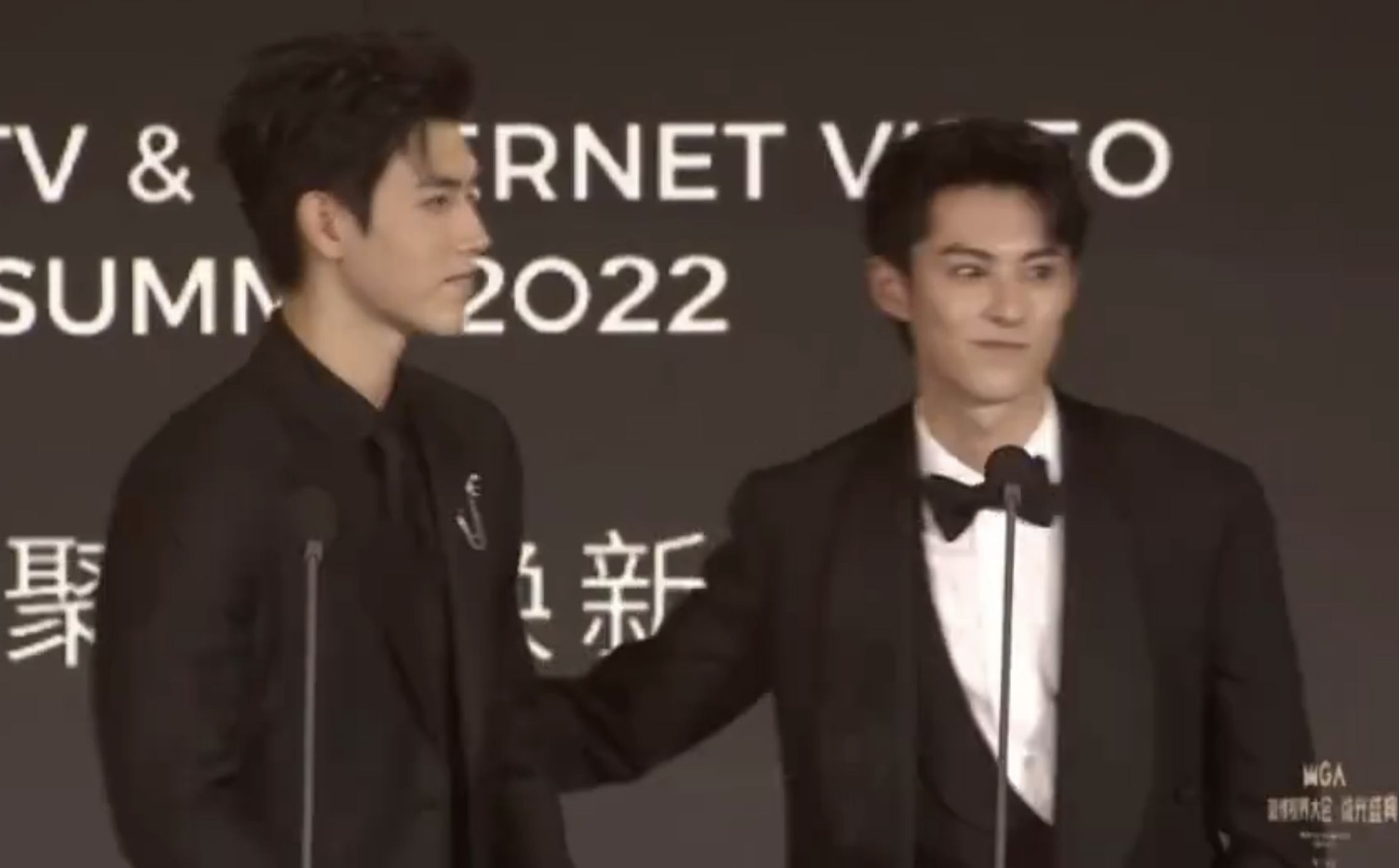 兩人一起發表獲獎感言,也是難得的緣分。結束后,兩人一起下臺,轉身的時候,王鶴棣還摟了陳飛宇的背,然后一起唱了告白氣球,帥哥互動可真難得。