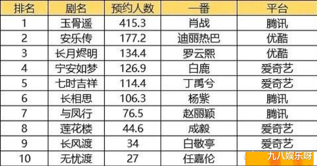 從這些作品的預約人數也能夠看出哪些作品的熱度比較高,比較受歡迎一些。從最新的待播古裝劇預約數據來看,共有6部劇突破了百萬,其中由肖戰和任敏合作主演的《玉骨瑤》突破了400萬,斷層排在第1名。