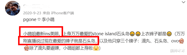 還有李小璐一發完照片,PGone就在直播強調自己只穿某幾個品牌的衣服,其中一個是最愛的牌子,這個牌子正好就是李小璐穿著的那一身——最愛哦!