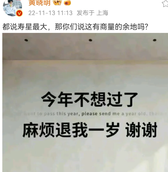 黃曉明發文慶祝自己的生日, 11月13日中午11點13分,黃曉明發文慶祝自己的45歲生日。他特地發了一張照片,出乎意料,他的靜態照片不是生日照,更不是自拍,而是有文字的照片!