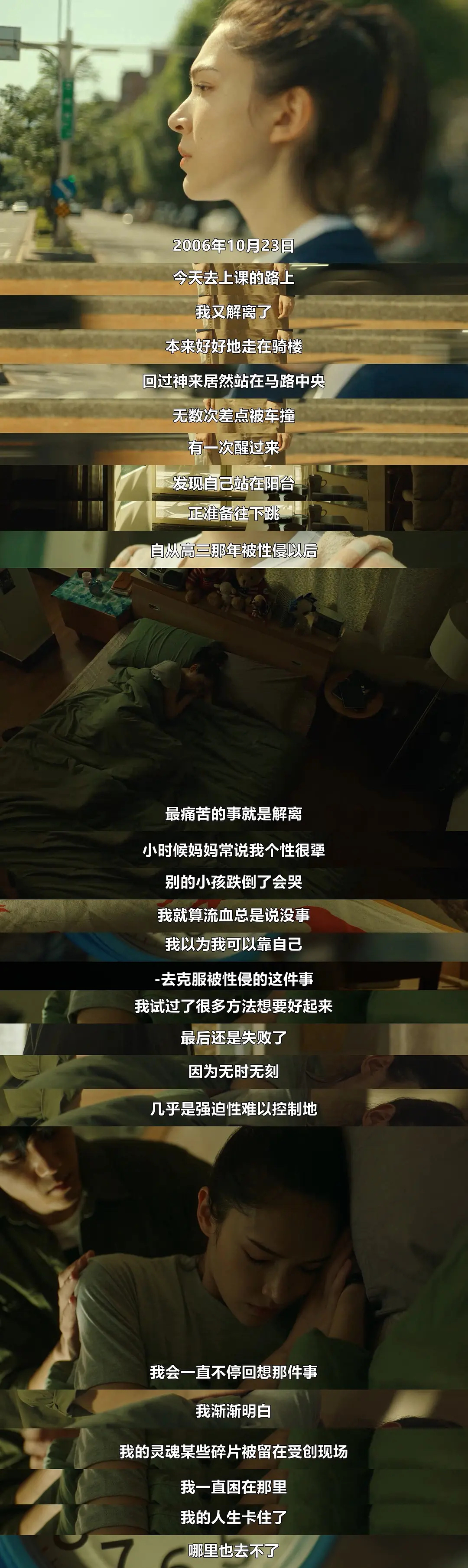 其中一句曾讓小盤流淚滿面:“我的靈魂某些碎片被留在受創現場,我一直困在那里,我的人生卡住了,哪里也去不了。”