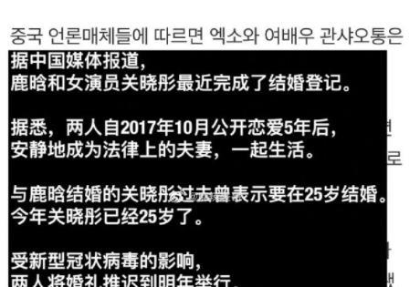 近日有韓媒曝出了一則消息,該消息一經曝出立馬在沖上了熱搜榜首,該消息就是鹿晗關曉彤疑似已經領證,該消息是這樣說的鹿晗和女演員關曉彤最近結束了結婚申報。