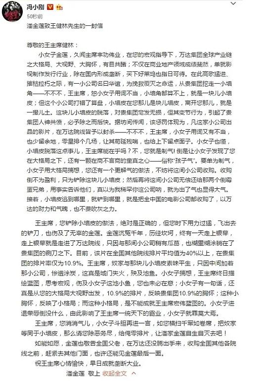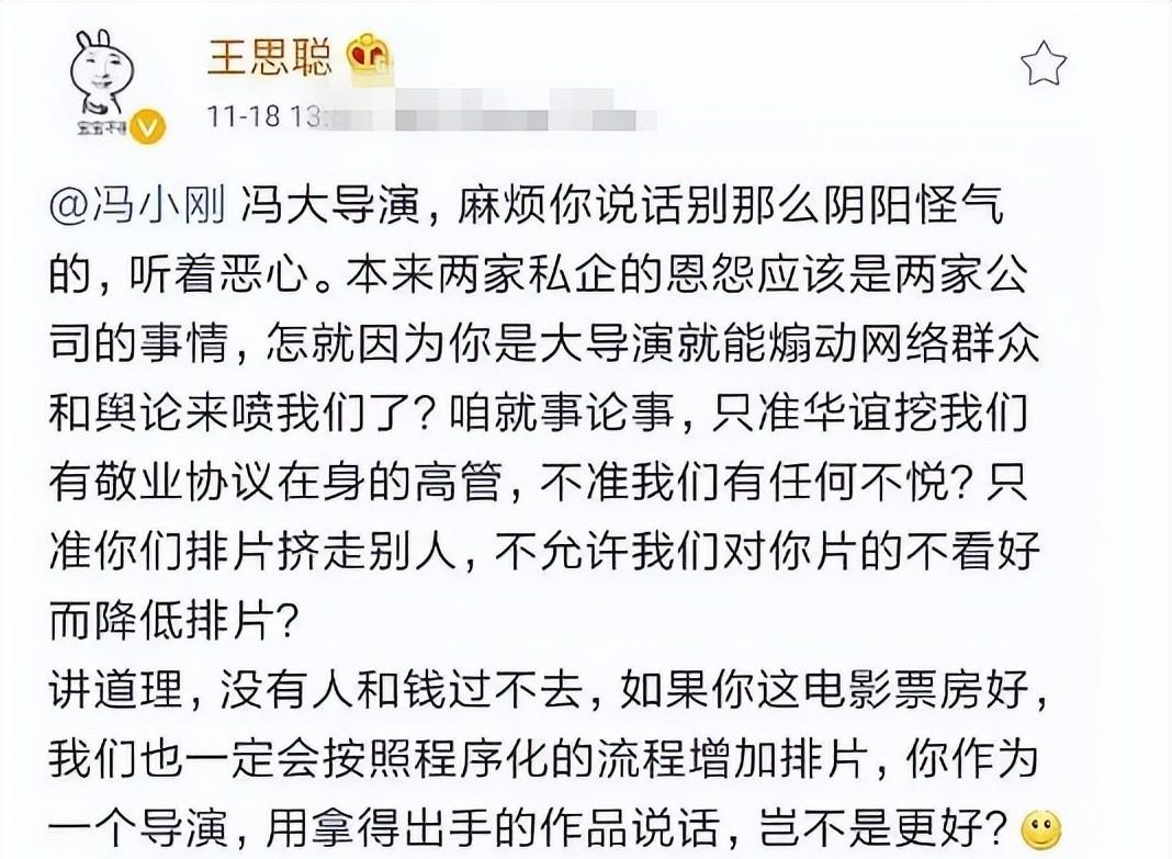 2016年,馮小剛導(dǎo)演的《我不是潘金蓮》上映,因為排片問題,和萬達(dá)好好撕了一把。開頭把王健林一頓猛吹,夸萬達(dá)有格局,有視野,有大胸懷,一頓彩虹屁。