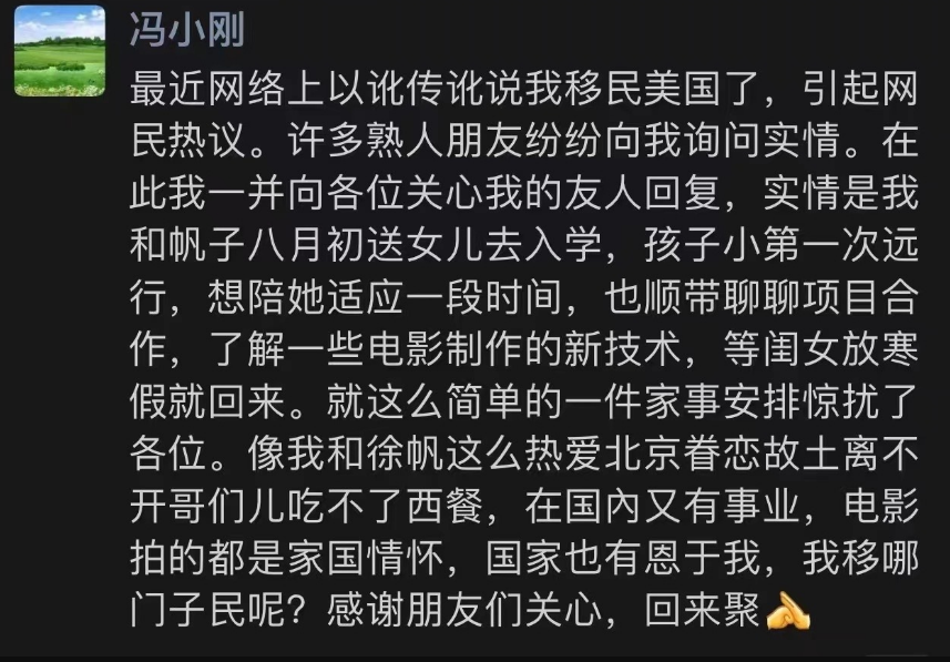 輿論傳得沸沸揚揚時,馮小剛才出來辟謠,表示這是以訛傳訛,自己的事業(yè)都在國內(nèi),不過是送女兒去國外上學(xué),擔(dān)心她不習(xí)慣。根本不存在移民一說。還是要回到國內(nèi)的。