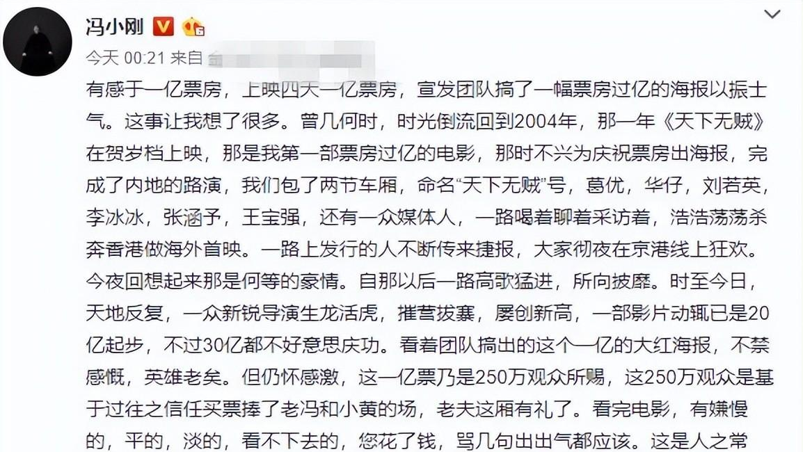 面對慘敗,馮小剛一改常態(tài),發(fā)文感慨,想起2004年導(dǎo)演的電影《天下無賊》票房大獲成功時的輝煌,包了車廂,吃著火鍋,唱著歌,好不愜意。