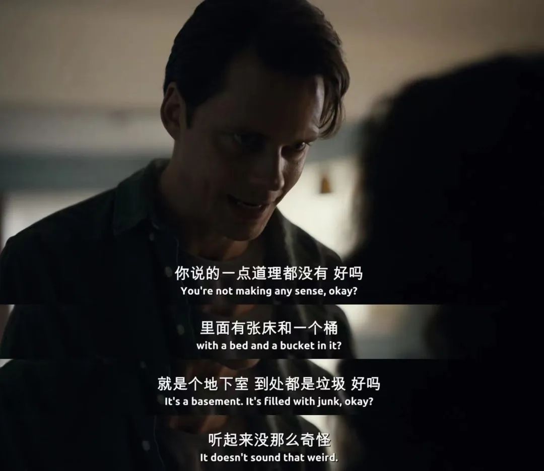 在女主向男房客,描述自己在暗門后發(fā)現(xiàn)的恐怖景象時,說自己看到了床、桶、攝像機(jī)、血手印等。