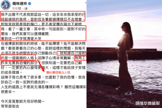 而在兩人的婚姻中,吳速玲疑似還被家暴,曾曬出用包包擋臉的照片,脖子、臉上都有淤青傷痕。曹格之前也承認,自己有嚴重躁郁癥,控制不住自己的情緒。面對這樣的丈夫,每天如同陪著定時炸彈,換誰也受不了。