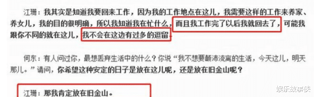 后來江珊在節目中曾透露,她在國外生活時沒有工作和收入,為了維持在國外和女兒的生活費用,她決定每年回國拍一部戲,拍完戲就走。