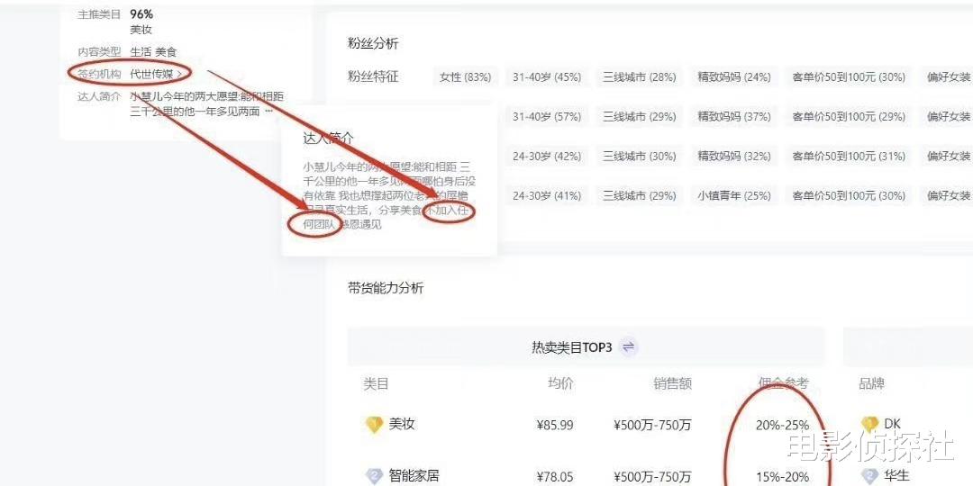 除了可以看到樊小慧背后是簽約了公司之外,也可以看到樊小慧的帶貨傭金,排名前三的類目是美妝、智能家居、食品飲料,傭金分別是銷售的20%左右,上下有5%的漲幅,帶貨能力很強(qiáng)的樊小慧賺取的收益也很可觀。