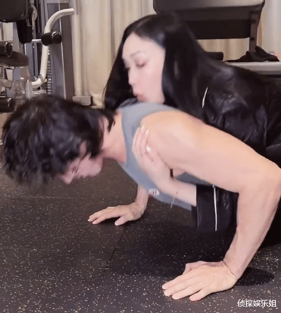 鐘麗緹趴在老公的背上露出超享受的表情,真是將小嬌妻的溫柔動人演繹得淋漓盡致。而張倫碩則兢兢業業地背著老婆大人做雙人俯臥撐,寵妻十足。