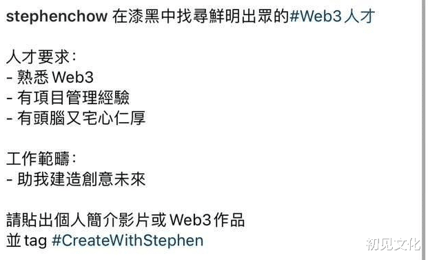 以上正是提出了周星馳對人才的要求,大致內容是:在黑暗中尋找優秀的Web3人才,“幫我打造一個有創意的未來”。