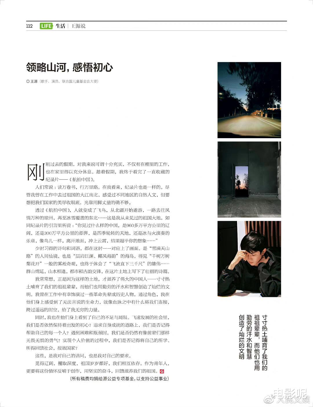 王源的最新一篇王源說《領略山河,感悟初心》,是借《航拍中國》紀錄片,講述愛國的少年心。始終懷抱著一顆赤誠的愛國心,作為偶像,王源真的有在好好用他的社會影響力給大家傳輸積極的正能量。