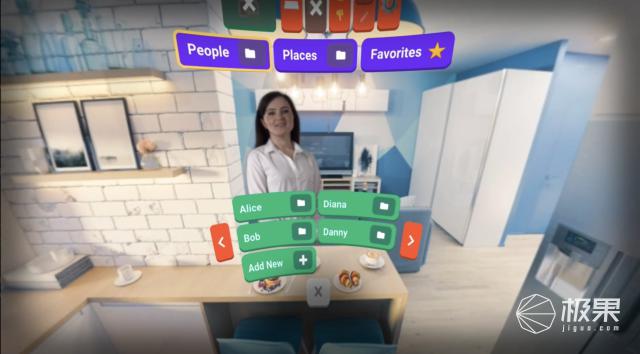 設備內置了顯示屏,顯示屏上有顯示菜單欄,常見的 AR 應用都有,涵蓋電影、音樂、游戲、通信和遠程控制電腦。用戶可通過菜單提問或回答問題,所想表達的內容會以文字的形式在前端屏幕上呈現出來。