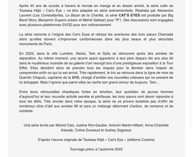 根據(jù)法國電影雜志《Le Film Fran?ais magaizine》報道,北條司的《貓眼三姐妹》漫畫改編真人法國電視劇集將一共有 8 集,每集 52 分鐘。劇集將設(shè)定在 2023 年的現(xiàn)代。拍攝計劃于秋季開始。