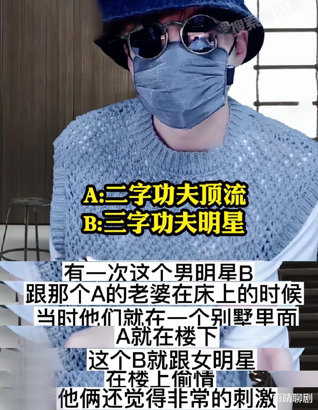 12日,狗仔提到的二字功夫巨星A的老婆出軌三字功夫男星B,且在自家別墅的樓上偷情,彼時男星A就在樓下,兩人仍無所畏懼,甚至還覺得十分刺激,讓人直呼三觀盡碎!