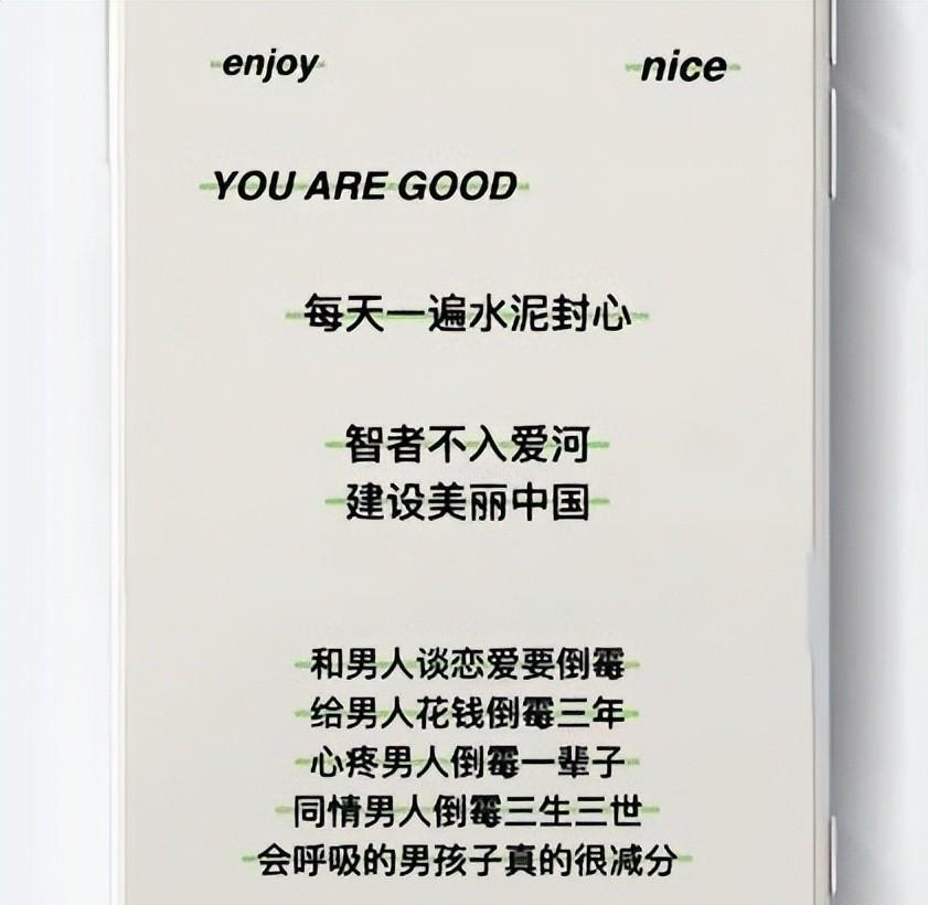 張雨綺這張手機(jī)殼,風(fēng)格非常簡約,沒有女孩子們普遍喜歡的那些花里胡哨的圖案和色彩,只有幾行文字,而這些文字,字里行間,都透露著張雨綺強(qiáng)烈的“厭男”情緒。
