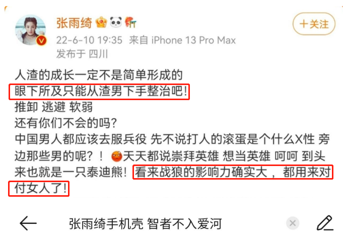 也正是因為張雨綺手機(jī)殼上的文字太過激進(jìn),張雨綺被罵上了熱搜,不少網(wǎng)友表示,張雨綺這是在貶低男人,或許張雨綺已經(jīng)被男人傷得神志不清了。