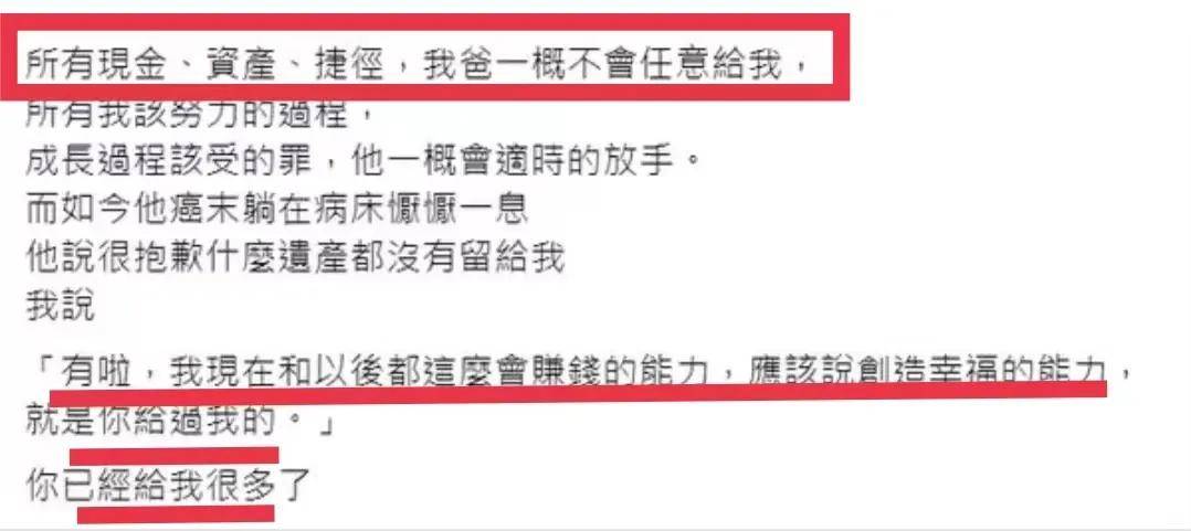 所有現金、遺產,我爸一概不給我,他說很抱歉什么都沒有留給我,我說:有啊,我現在和以后賺錢的能力,創造幸福的能力,就是你給我的,你已經給我很多了。
