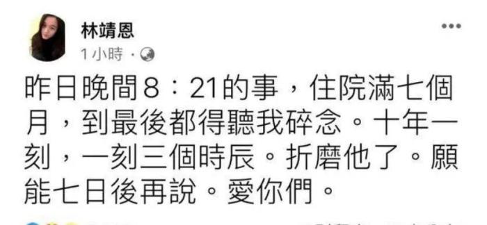 在同一天,林靖恩也以女友的身份也發文懷念李坤城,她是這樣說的:住院滿七個月,到最后都得聽我碎念。十年一刻,一刻三個時辰,折磨他了,愿能七日后再說。愛你們。