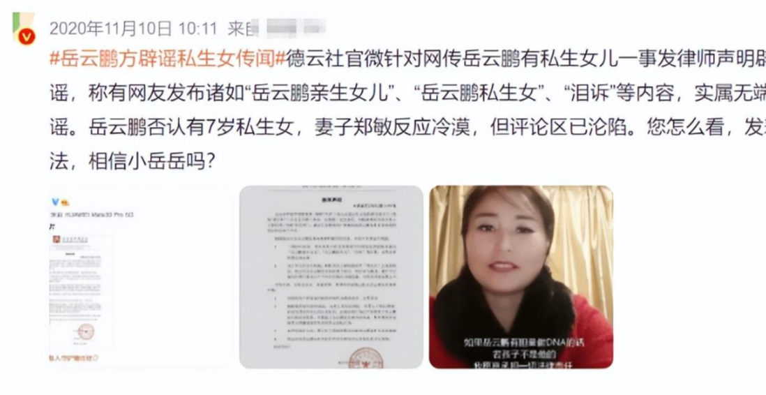 表示這些內容都是造謠,岳云鵬否認有7歲私生女。