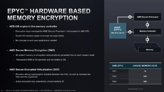 密鑰方面,它能夠對 ROM 到 DIMM 往來的數據做端到端的加密,另外還有幾個模式,一個是 SME 安全內存加密模式,這個模式下可以對任何系統重置,去使用一把單一生成的的隨機密鑰去做加密。還有一個模式是內存加密虛擬化 SEV 模式,也包括了剛才的 SNP 功能,它可以針對虛擬機配備一把密鑰,同時針對每一個訪客的登錄的進程配備另外一個單獨的密鑰,這些操作都是通過安全處理器來啟用。