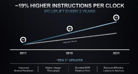 大家可以比較一下 Zen2 和 Zen 3 芯片布局的變化。從 Zen2 到 Zen 3,AMD 把 CCD 做了一個 8 核的整合,這樣一來所有的 8 個核心都能直接訪問本地的 32MB 三級緩存,通過這樣的設計就可以大幅降低數據延遲,對于那些對內存子系統訪問非常密集的應用來說這就可以有效地提高性能。