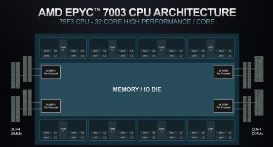 采用 Zen 3 架構的三代 EPYC 采用 CCX + Socket IO 整合的設計,CCX 中所有的 8 個核心能夠共享 32MB 三級緩存。此外,它還支持 PCIe 4.0,每內存通道對應兩個 DIMM 插槽,最高可支持 8 通道 4TB 內存(可支持 4、6、8 通道的內存交織配置,比之前的 EPYC 增加了 6 通道模式),在安全方面,三代 EPYC 在已有的虛擬化內存加密基礎上增加了 SNP 安全嵌套分頁,從整個系統來說不管從單線程、單核心還是每個插槽的性能來說都在服務器市場中做到了最強。