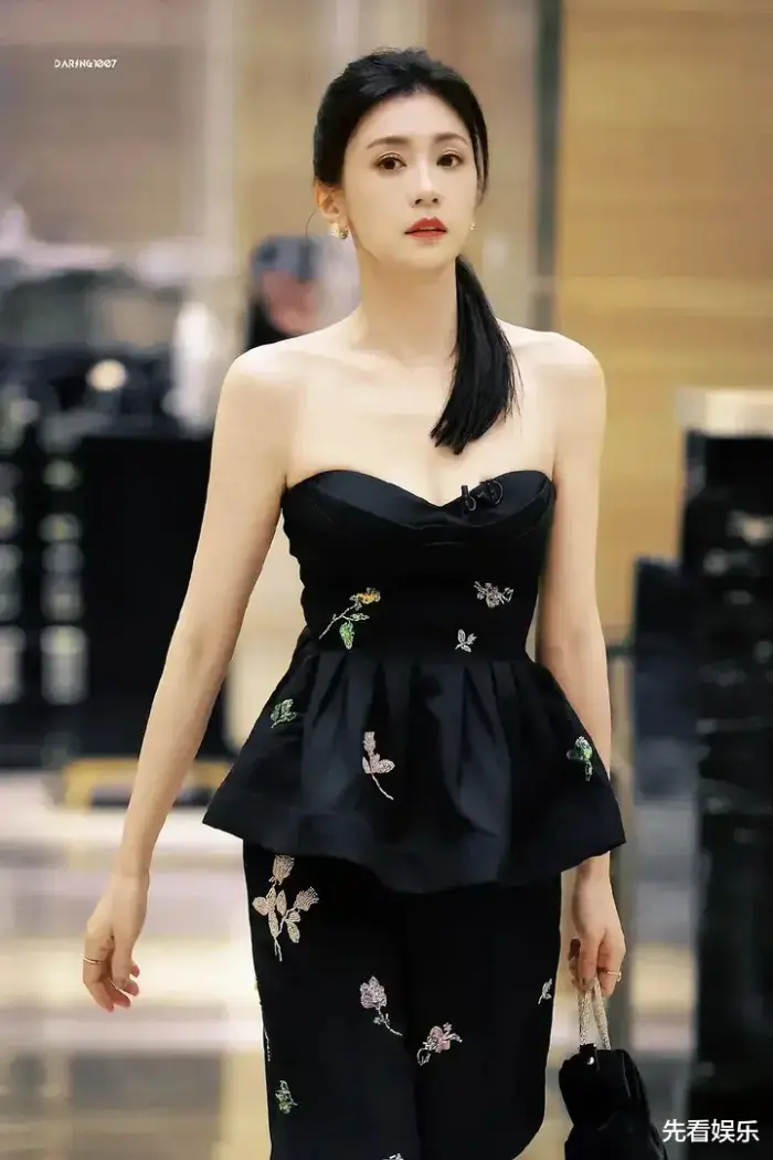 一襲抹胸黑色印花套裝+高馬尾亮相,瞬間讓人夢回《倚天屠龍記》的趙敏。