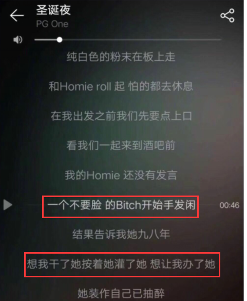 2018年,PGONE在音樂《圣誕夜》中的歌詞,再次掀起爭議。因其歌詞中出現醒目的低俗、色情、不尊重女性等內容遭到央媒點名后又被封殺。與此同時,多家官方媒體,相繼對該唱詞提出意見,稱其為不尊重行業和觀眾,傳播不良價值觀,也不配擁有嘻哈舞臺的藝人。