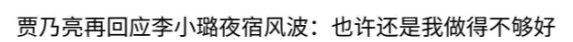 然而再多證據也抵不過賈乃亮對李小璐的信任,回應“夜宿風波”時表示,也許是他做得不夠好,把所有的錯都攬到自己身上。