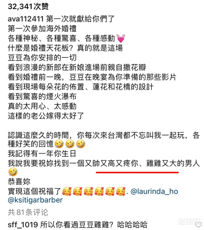 4月21日,賭王的新女婿竇驍上熱搜。然而,讓人沒想到的是,這一次竇驍并不是因為和新婚妻子何超蓮度的甜蜜,也不是因為成為豪門女婿后成為令人羨慕的富豪生活,而是因為妻子何超蓮的一位密友,爆出了一個大瓜。不少網友看到后炸了大喊“好家伙,隔著屏幕都能感受到竇驍的尷尬”[捂臉]據悉事情是這樣的,何超蓮的大婚,閨蜜們不僅來到現場祝賀的同時,他們也不忘在社交平臺上分享親密的友情。讓人沒想到的是,在詹子晴的祝福下,竟然埋下了一個大瓜。從詹子晴的發文可以看出,她和何超蓮的關系非常親密。何超蓮每次去臺灣,都會找詹子晴一起玩。兩人有很多有趣的回憶。比如詹子晴就曾經在何超蓮生日的時候許愿,希望何超蓮能找到一個高大帥氣,愛她,有大JJ的男人。詹子晴也得意地表示,這個祝福終于實現了。這條評論一出,竇驍立即出現在了熱搜榜首。不少網友看完后紛紛表示:這是在夸竇驍嗎?竊竊私語被撼動,這個閨蜜可以丟棄了[捂臉]臺妹真開放,竇驍的秘密現在全網都知道了[捂臉]防火防盜重在閨蜜[捂臉]明星肯定不好當,這樣的隱私話題被曝光了,太尷尬了[捂臉]笑話太可笑了,這種機密的事情都敢說,可見詹子晴和何超蓮的關系尤其非常好。不過,如今竇驍和何超蓮終于修成正果,到了全網煽娃的地步。希望竇驍和何超蓮不要浪費好基因,響應國家號召,多生孩子!