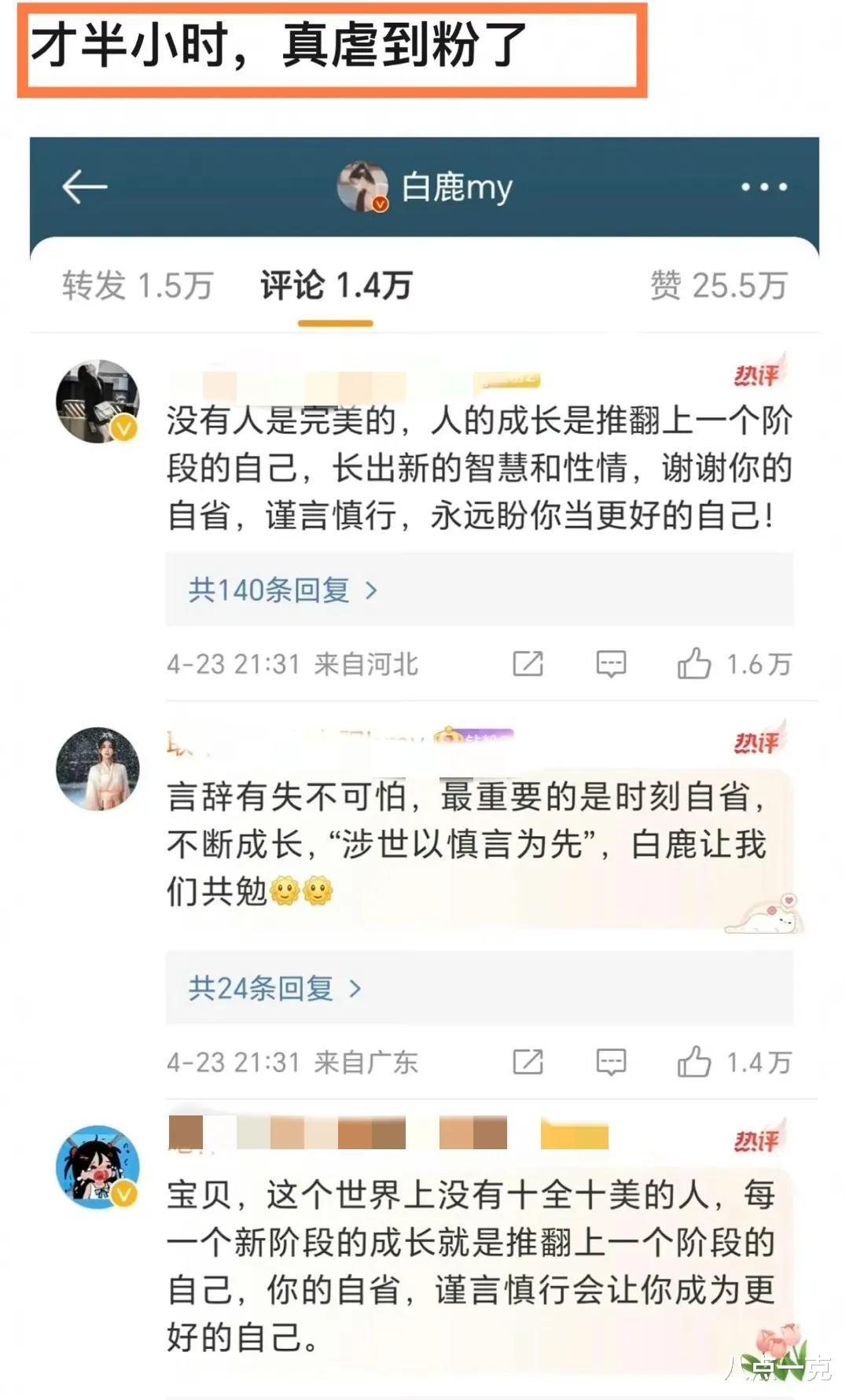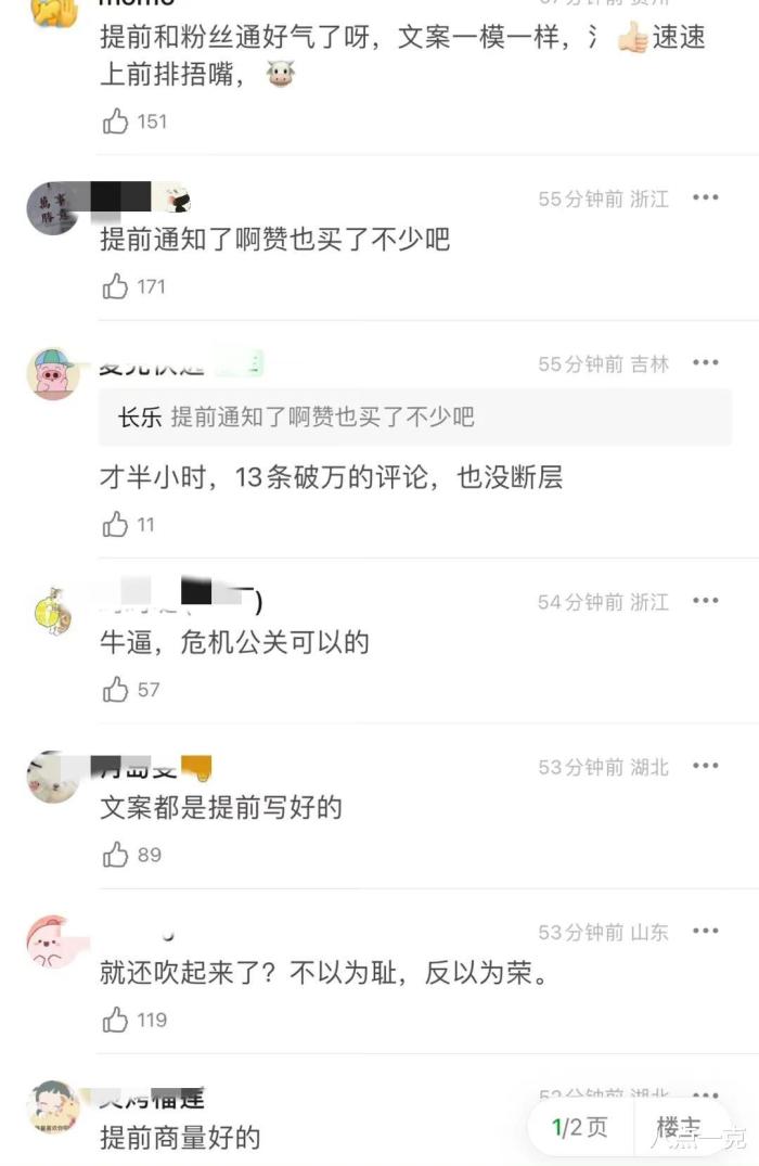 在道歉博文發出半小時后,白鹿評論區粉絲沆瀣一氣并且迅速占據前排位置,連文案都幾乎是一模一樣的,不得不說著危機公關能力在內娛真的是數一數二的高明。