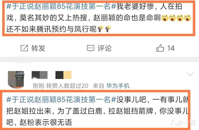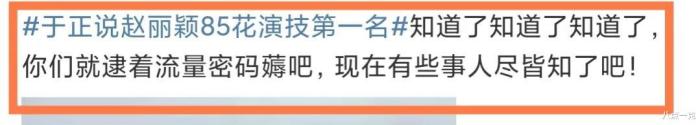果不其然,不久后“于正說趙麗穎85花演技第一名”的詞條沖上了熱搜,熱度和話題度一下子就蓋過了白鹿的黑熱搜。對此很多網友紛紛留言表示,人還在拍戲莫名其妙上了黑熱搜,于正為了蓋過白鹿就拉趙麗穎出來當擋箭牌,這種操作真的很讓人無語。