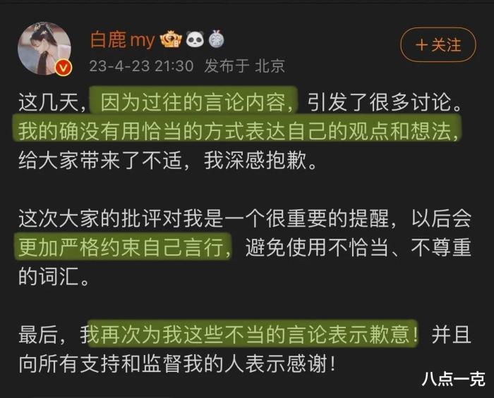 4月23日在“精神男人”“小母狗”的言論發酵兩天后,白鹿在社交平臺上發布了道歉博文,為過往的言論像大家道歉,并表示以后會更加嚴格約束自己的言行舉止,會避免使用不尊重、不恰當的詞匯。
