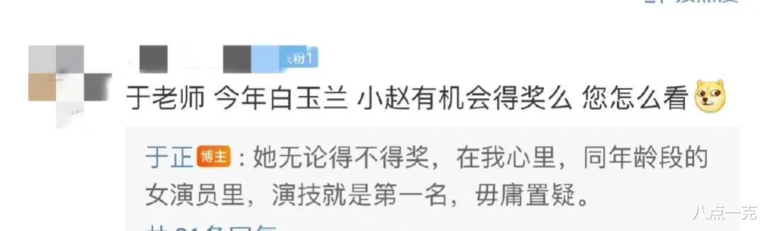隨后有網友在評論區問于正,今年的白玉蘭趙麗穎有機會得獎嗎?于正回復稱:無論她得不得獎,但在我心中,同年齡段的女演員里演技第一名是毋庸置疑的。