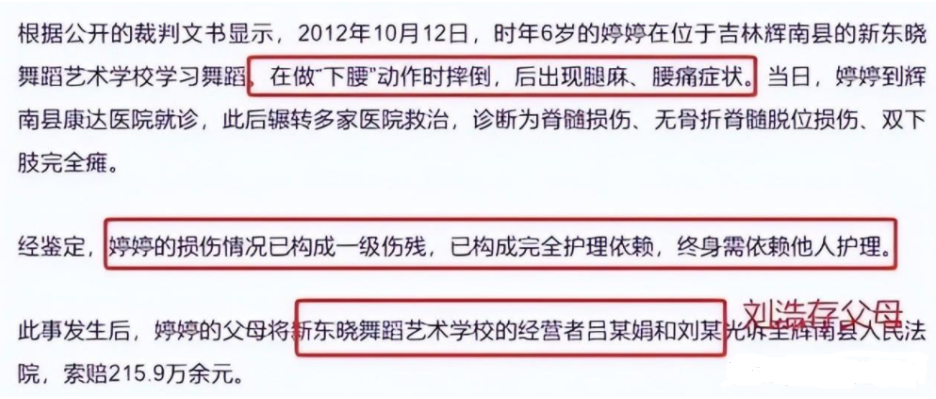 早在2012年的時候,劉浩存家的舞蹈學校發(fā)生過一場慘劇,一個12歲的小女孩因為老師的輔助不當,導致下半身癱瘓。