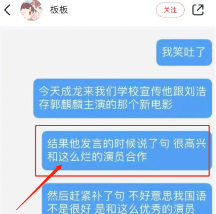 以至于,有一次在某高校宣發(fā)時,成龍無意地說了句,“很高興和這么爛的演員合作”。
