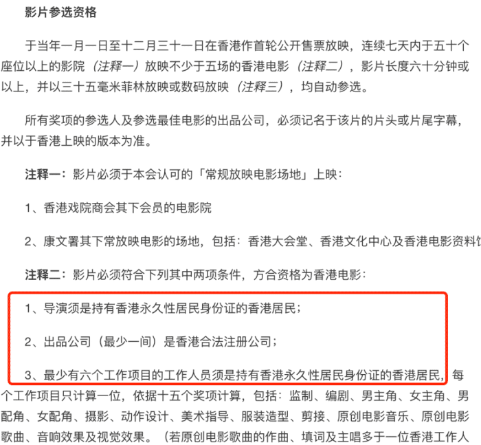 我們需要明確一個概念是:參加香港金像獎有諸多條件,其中“導演必須持有香港永久性居民身份證”“最少一間出品公司是香港合法公司”“最少有六個工作項目的工作人員是持有香港永久性居民身份證的香港居民”,三個條件,必須滿足兩個。