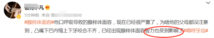 也有網友察覺不對勁,指嗯哼這樣的面容是非常嚴重的腺樣體面容,稱嗯哼這是患病了,因為長期張著嘴巴呼吸,腺樣體肥大,就會有這樣外突的嘴巴,建議霍思燕和杜江帶著嗯哼去看看醫生檢查一下。