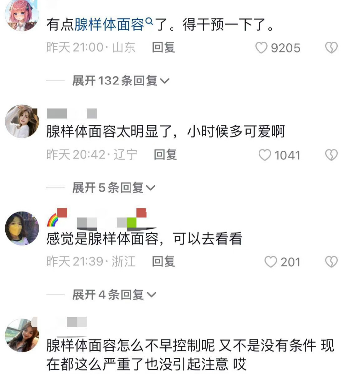 有專家也跟隨發表腺樣體面容的科普知識,正常呼吸是空氣進入鼻腔經過腺樣體到氣管再到肺部,但如果腺樣體肥大,鼻腔呼吸不通暢,就會用嘴巴呼吸。但小孩骨骼還在發育中,有塑造性,總是用嘴巴呼吸,鼻子作用就小了,下顎內縮下沉,上顎上移,口腔變高,鼻腔變小,就是典型的現腺樣體面容了。