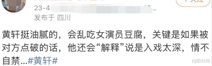 也有網友爆料,在和楊冪拍《翻譯官》時,有一幕背著楊冪的時候,楊冪穿著短褲,黃軒的手在楊冪的大腿上從上到下磨蹭。