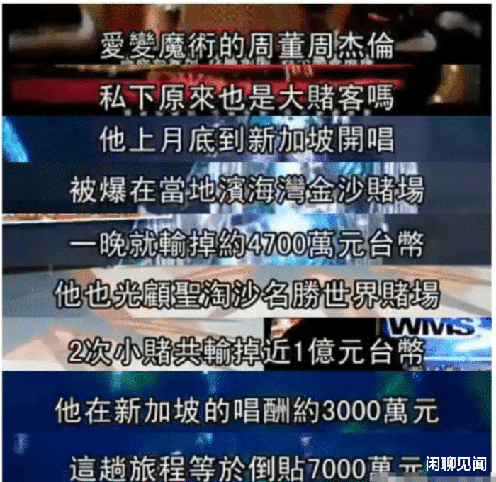 后來,周杰倫還在新加坡經營賭場,兩次“小賭”總共損失了近1億元新臺幣。據傳,周杰倫在新加坡開演唱會只賺了3000萬元,還要賠7000萬元。